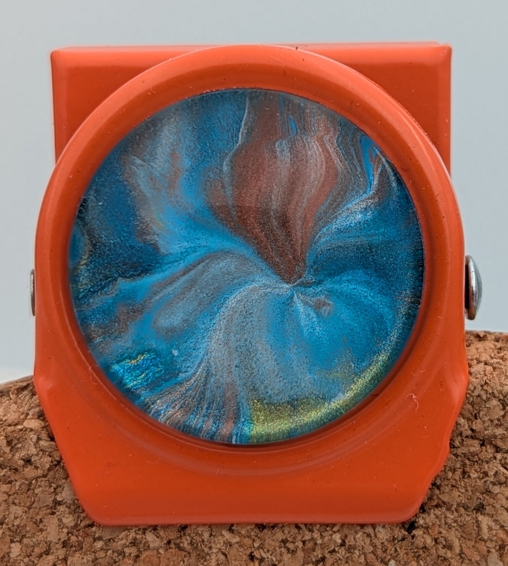 A deep midnight blue swirls with quiet gravity, while its companion blooms in luminous teal and copper — like a cloud of ionized gas igniting in distant space. One magnet holds the hush of interstellar shadow; the other glows with the soft radiance of a forming star.