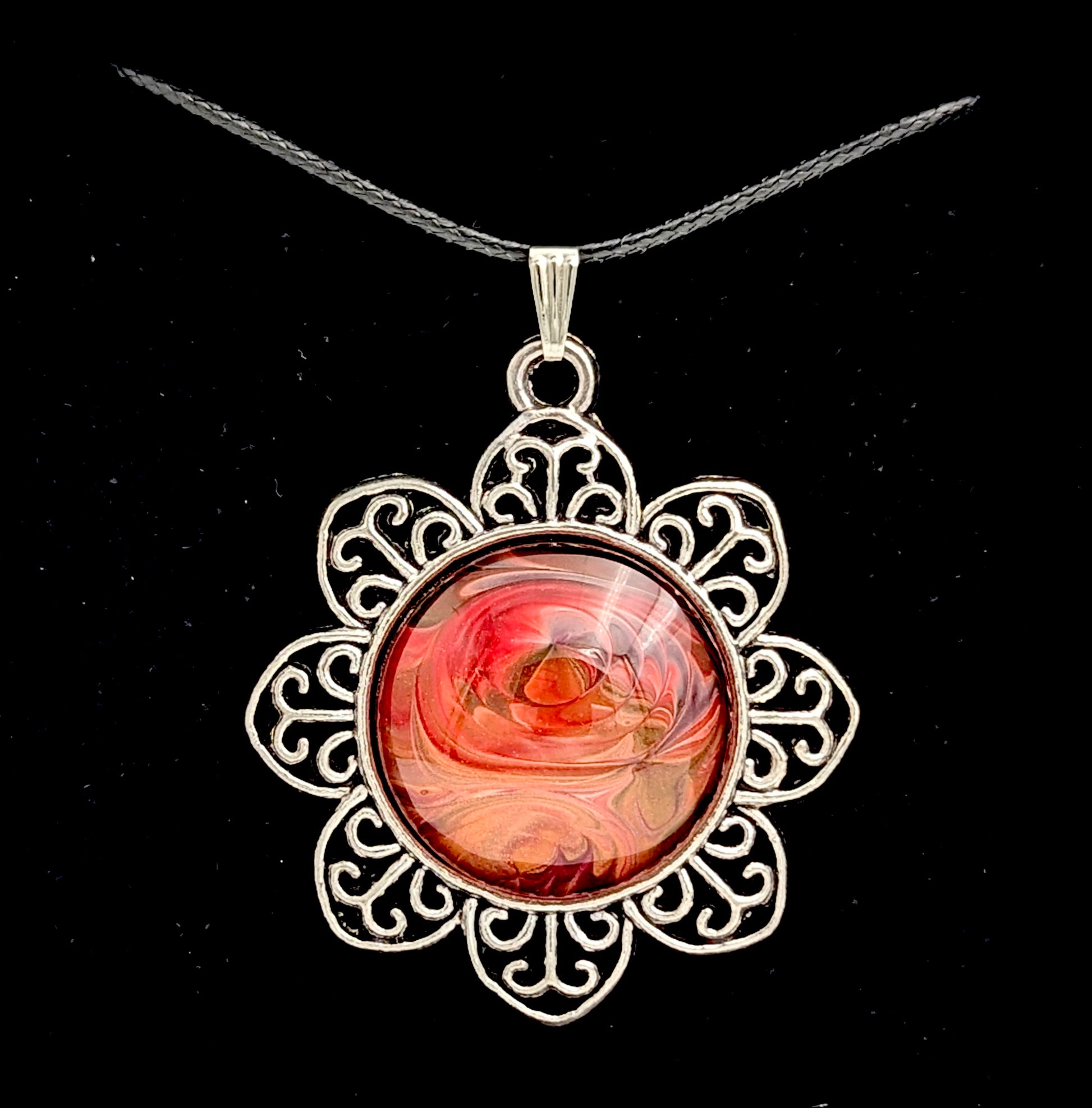 The round pendant is framed by an ornate, floral-inspired silver-toned setting that echoes the idea of a bloom unfolding — delicate in shape, yet bold in presence.