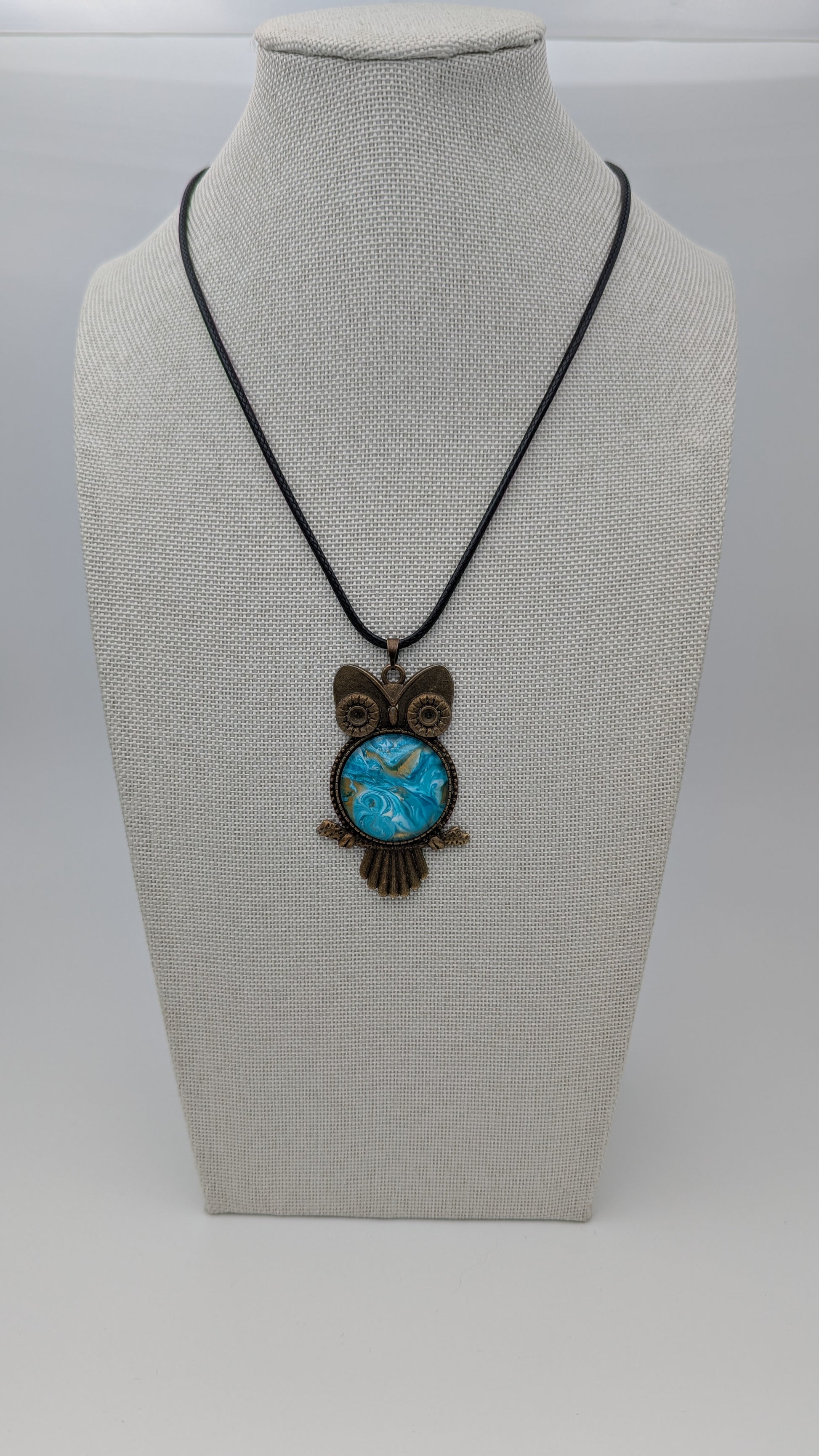This necklace showcases original acrylic artwork created using a fluid art process, carefully sealed under glass to preserve its depth and motion. The owl-shaped pendant adds a touch of whimsy and symbolism — often associated with intuition, observation, and calm presence. Each piece is completely one of a kind, shaped by the natural movement of paint and the moment it was created.